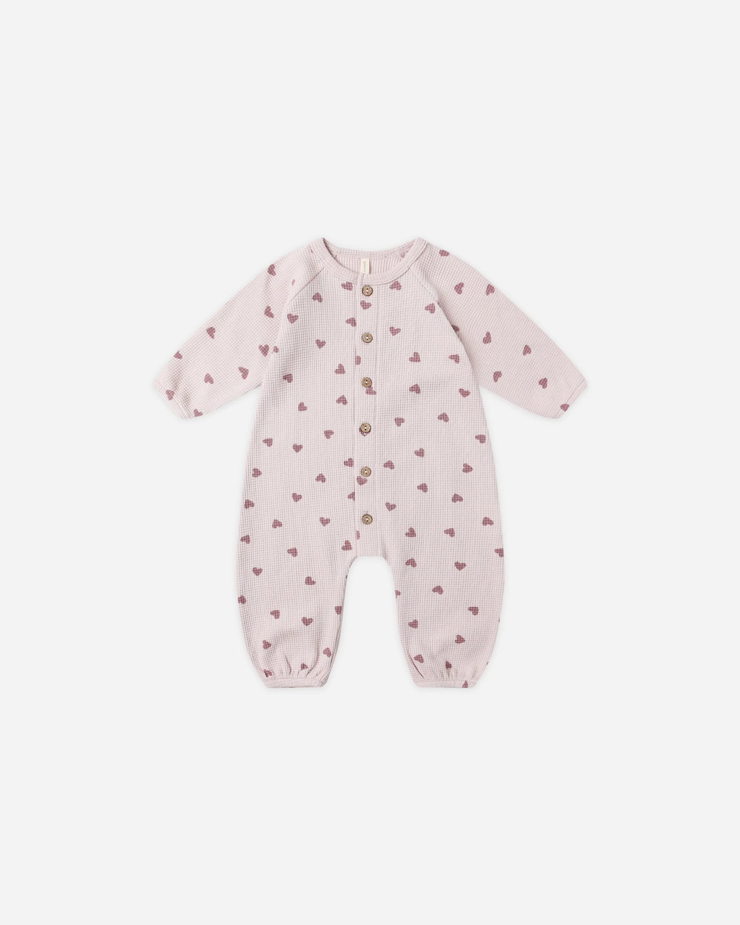This cozy waffle knit raglan jumpsuit features coconut buttons down the chest and elastic at the wrists and ankles for a comfy fit.