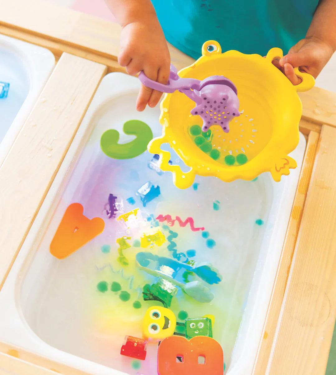 Includes 3 sensory tools: Puffer Pal Expandable Strainer, "Clamp" Shell Tiny Tongs, and a 3-in-1 Scooper Squid!
