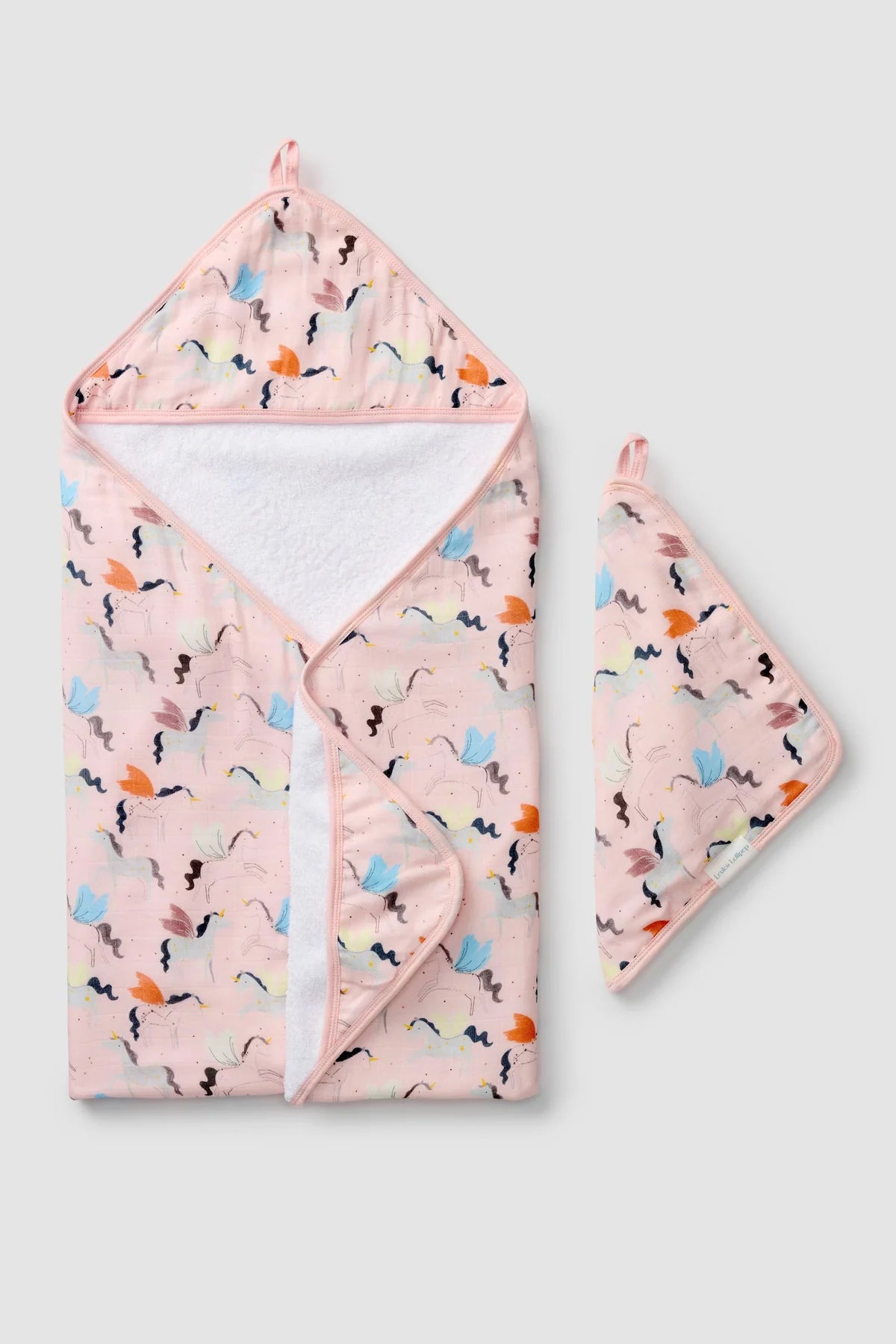 Hooded towel measures 32" x 32", and washcloth measures 12" x 12".