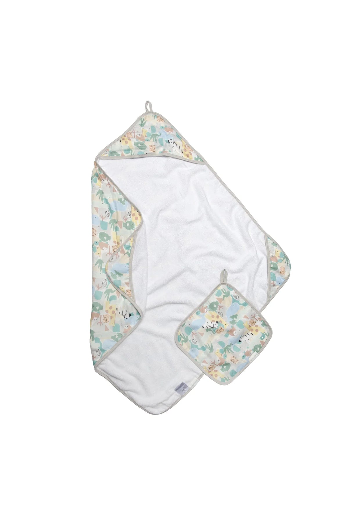 Hooded towel measures 32" x 32", and washcloth measures 12" x 12".