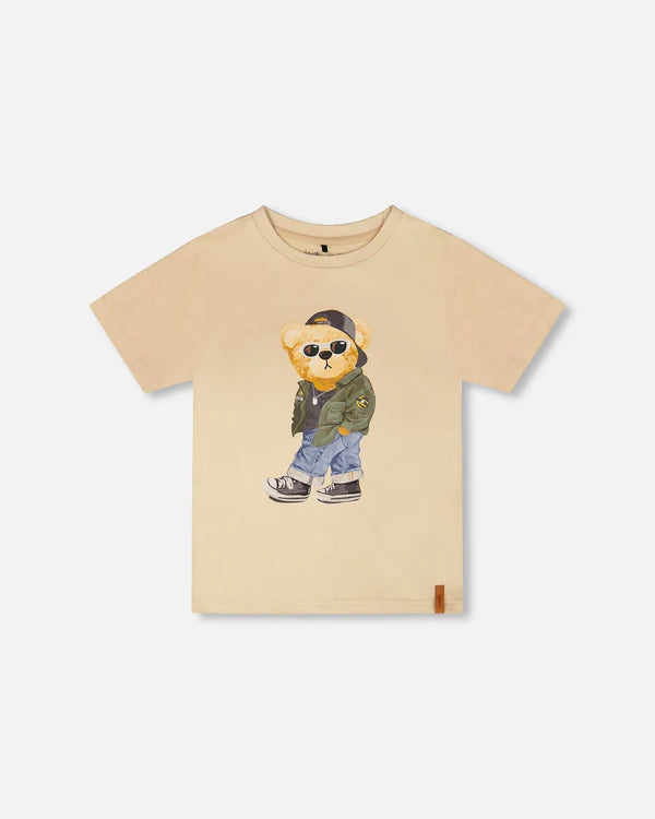 The organic cotton jersey t-shirt with print beige is perfect for adding a fun urban vibe to everyday outfits. This short-sleeve tee features a round neckline and a cool teddy bear dressed in street-style clothes printed on the chest, bringing a playful and trendy touch. Crafted from soft organic cotton with a hint of stretch, it ensures all-day comfort while being part of our “B.O.Y.S.” collection.