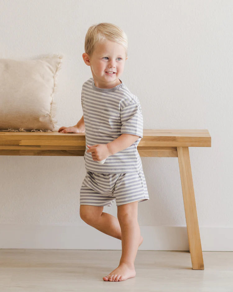 This brushed jersey set features a boxy pocket tee paired with drawstring shorts.
