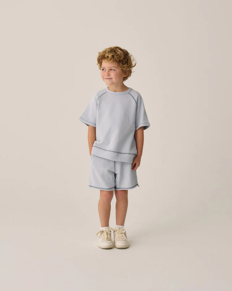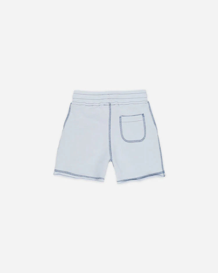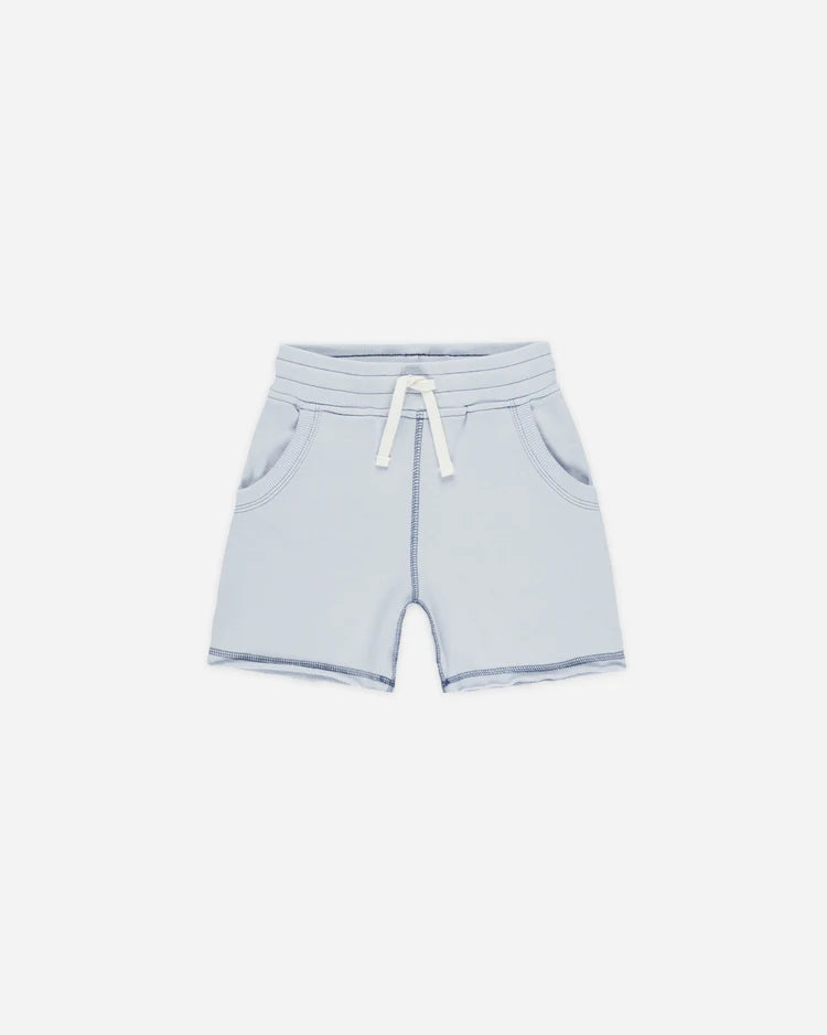 An everyday short featuring a classic elastic waistband, durable drawstrings, side pockets, and a raw edge.