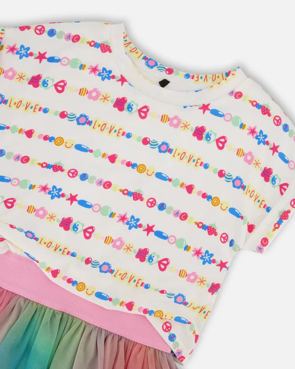 She'll look sweet as can be in our Bi-Material Dress with Mesh Skirt Multicolored Tie Dye and White. This darling little dress features a jersey knit bodice with rolled short sleeves, a round neckline, and a colorful allover candy print. The flared A-line skirt features a stretchy pink elastic waistband and multicolor mesh layers that make it oh-so-fun to wear!