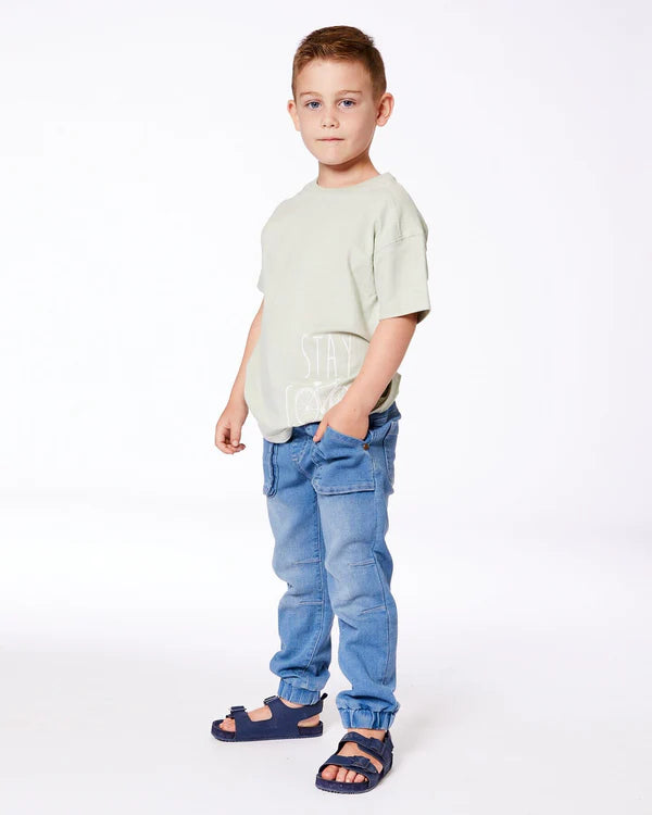 With darted knees and elastic ankles, our French Terry Denim Jogger Pant Denim Blue is equal parts soft, stretchy, and stylish! These essential pants are made from stretch cotton/poly French terry and feature a drawstring waistband, front utility pockets, and logo rivets for a touch of signature style.
