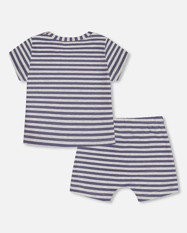 Two-tone horizontal stripes lend nautical charm to our Organic Cotton Short Sleeve Top and Short Set Striped Navy. Ultra-soft in cotton jersey, this set features a short sleeve tee with a crew neckline, shoulder straps, and a contrast patch pocket on the left chest. A matching striped short with a stretchy elastic waistband makes it a cute and comfy choice for a long day of play!