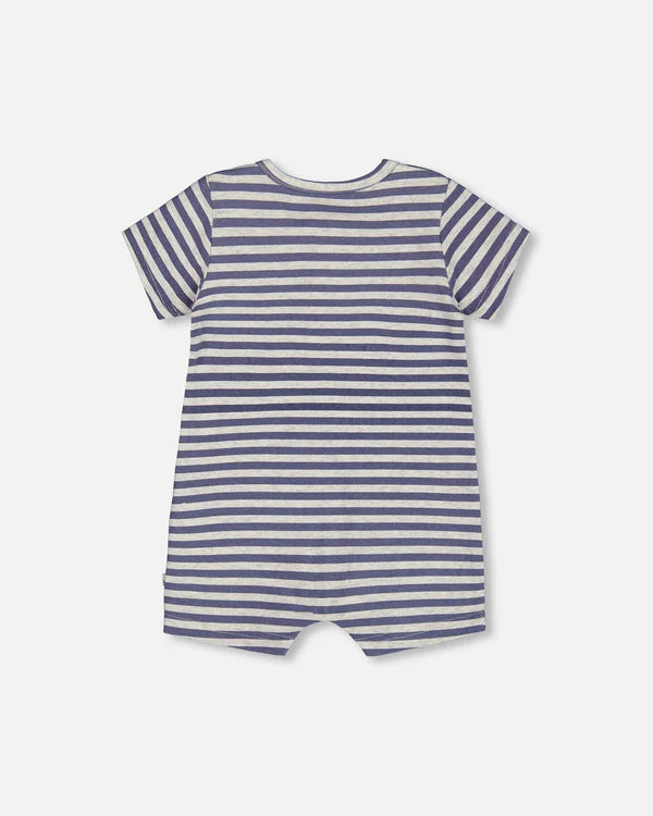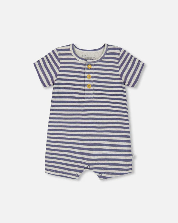 Oh-so-soft and comfortable to wear, he's sure to love the look and feel of our Organic Cotton Printed One-Piece Romper Striped Navy. This printed romper features short sleeves, a round neckline with a three button placket, and snap legs. Allover horizontal stripes add a fun, nautical touch!