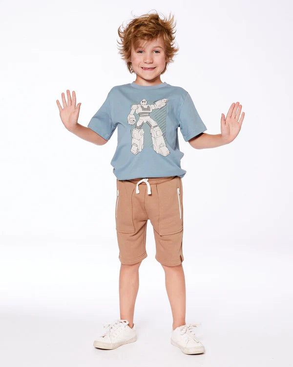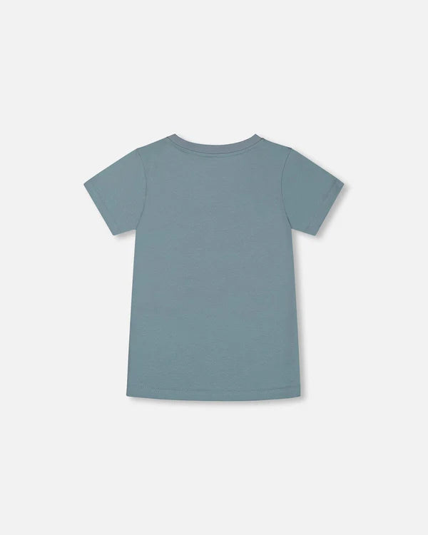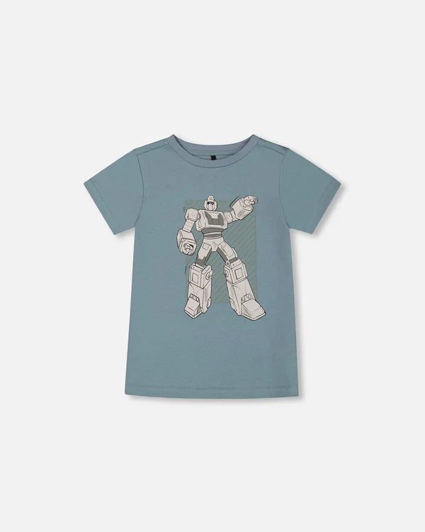 Our Organic Cotton Graphic Tee Grayish Teal and Robot is a must-have in every little boy's wardrobe. This cool, comfy tee features a classic fit with short sleeves, a crew neckline, and a large robot graphic on the chest. Wear it on its own or layer it with a zip front hoodie from our B.O.Y.S. collection!