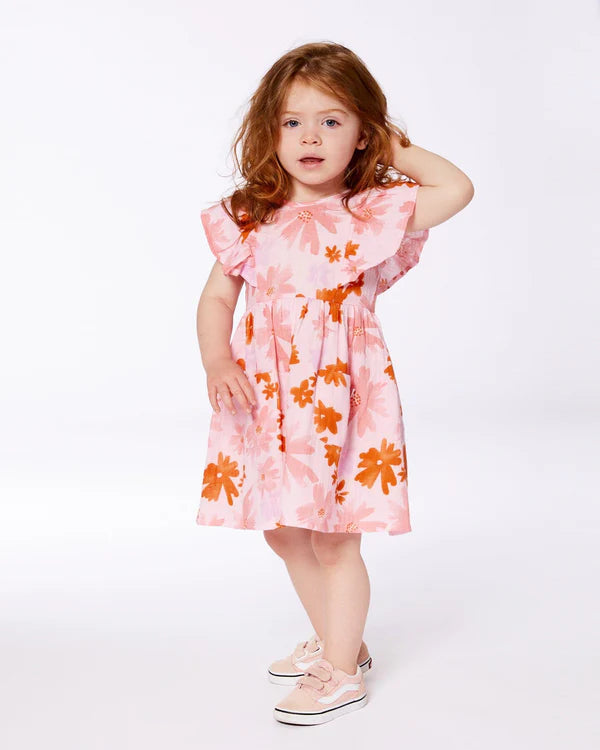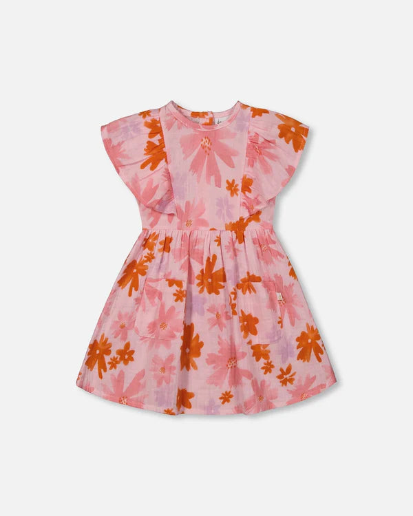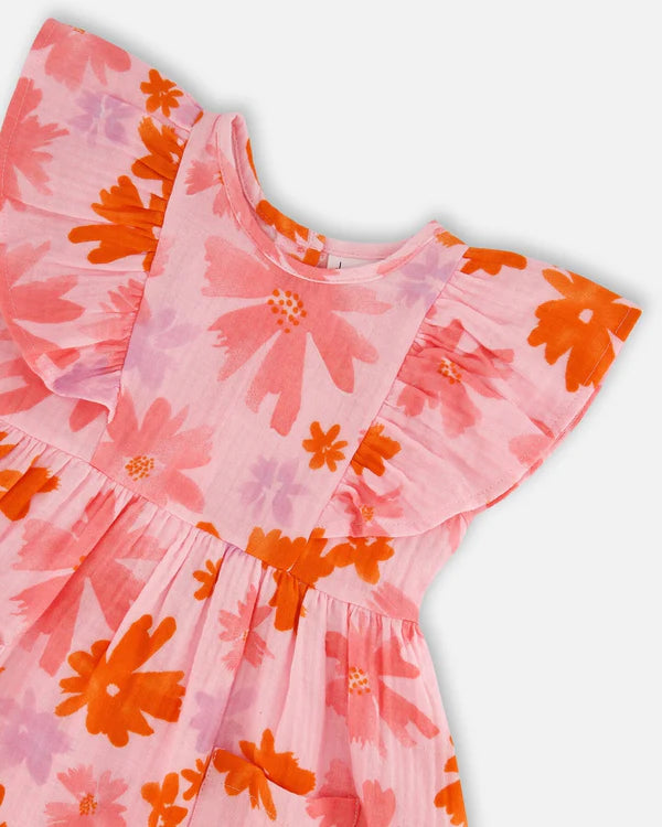 A vibrant floral print makes our Printed Muslin Dress Pink and Coral Flowers a sweet addition to any little girl's wardrobe. Perfect for any spring or summer day, this dress is made from lightweight cotton fabric and features a flared silhouette with flutter sleeves, a round neckline, and two front patch pockets. Whether she's heading to a party, a play date, or a family outing, it's a winning look!