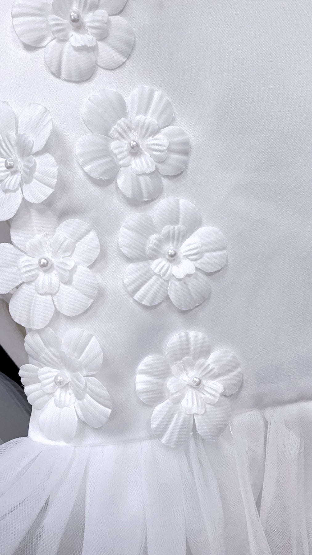 Jolene White Dress. Beautiful white sleeveless dress with pearl beaded applique flowers on bodice and on the tulle skirt overlay with tulle tie bow in back. Floor length train with pearl beaded applique flowers scattered along skirt.