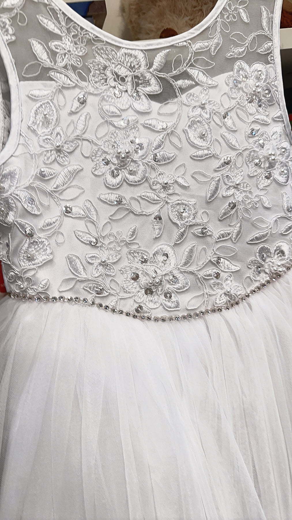Jolene Holiday Collection Dress. Beautiful white sleeveless dress with beaded floral embroidered bodice, tulle skirt overlay with tie bow in back. Decorative rhinestone accent at the waist.