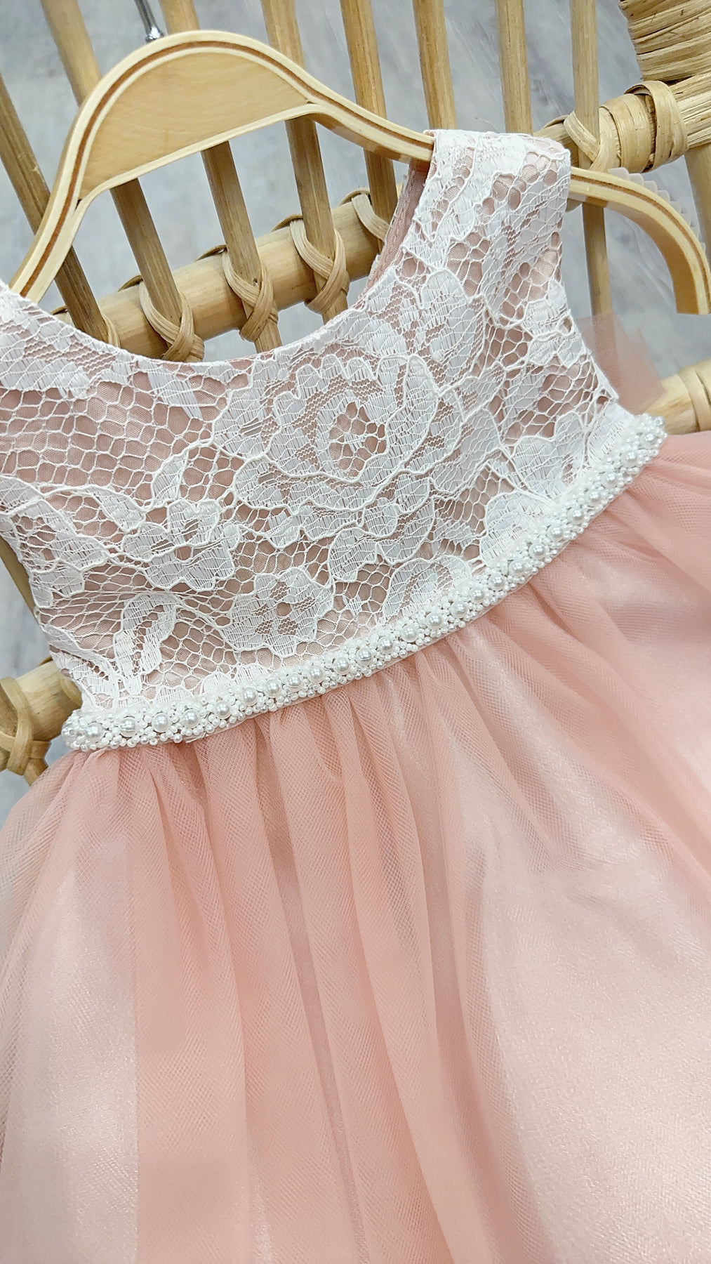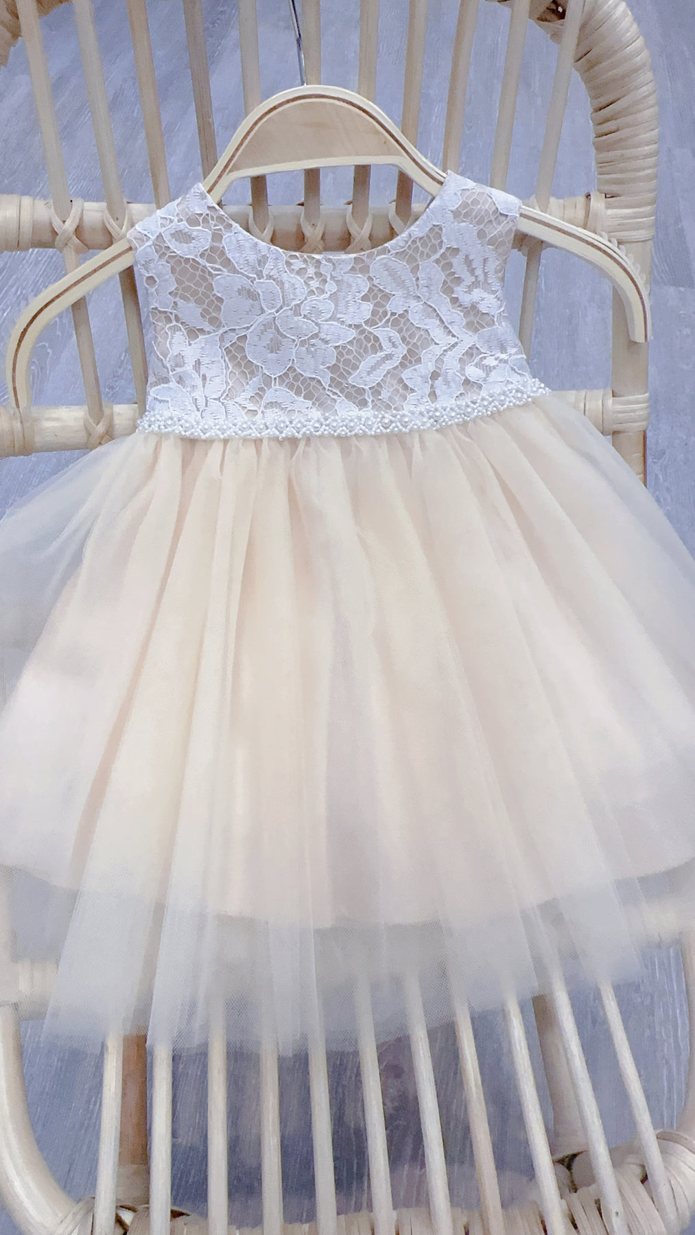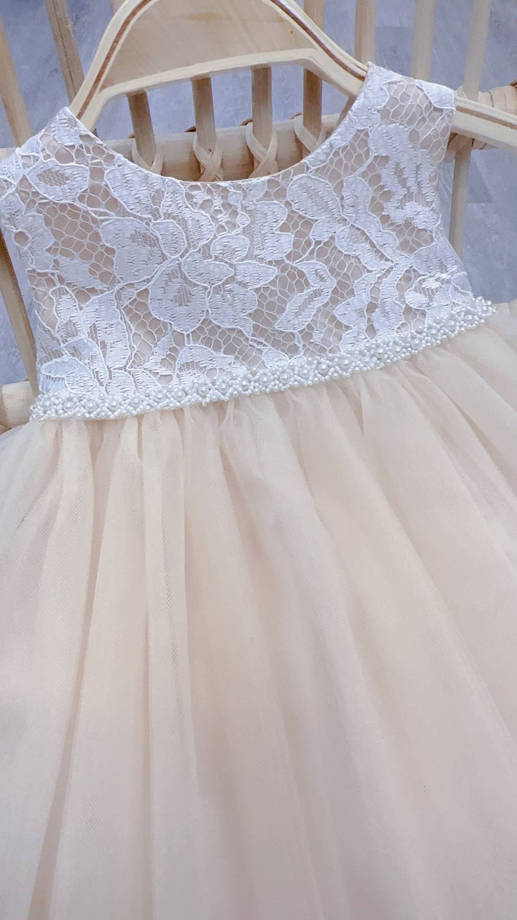 Jolene Lace and Tulle Infant Dress. Adorable sleeveless dress with white lace bodice overlay, tulle skirt overlay with tulle tie bow in back. Decorative pearl band at the waist.