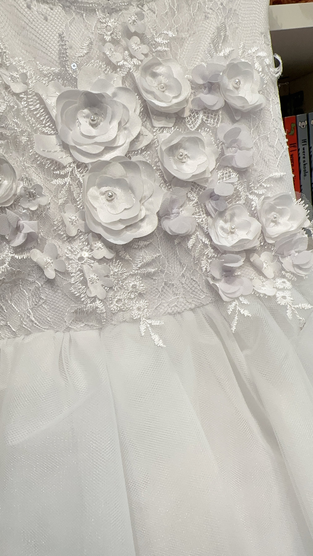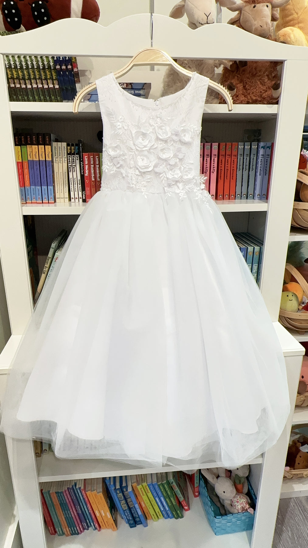 Jolene White Dress. Beautiful sleeveless dress with floral lace applique bodice and tulle skirt overlay with tie bow in back. Decorative beaded accent at the neckline.