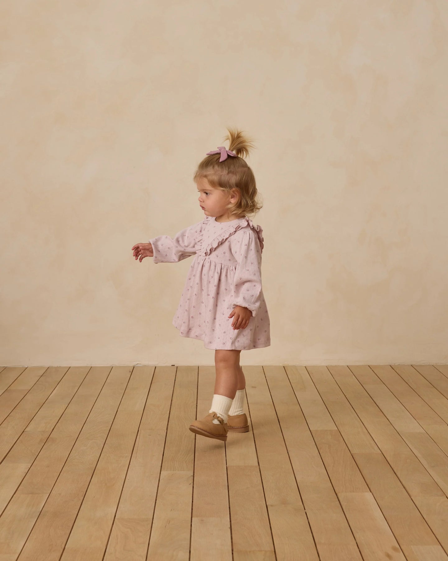This long sleeve dress in our classic pointelle fabric features delicate V-ruffle detail, a button-back closure for easy changing, and matching bloomers for a sweet finishing touch.