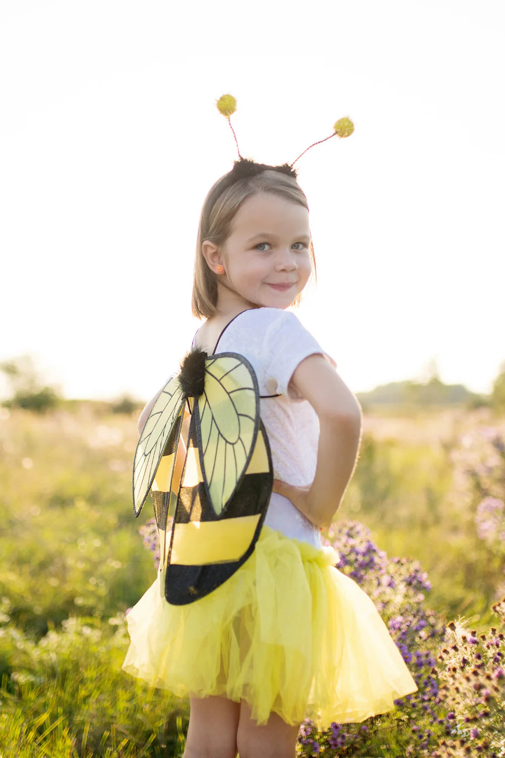 This is one cute little bee that you won't mind buzzing in your ear. Our Bee-utiful 3 piece set includes a tutu skirt, wings and headband. The yellow tutu combines soft tricot with yellow sparkle tulle. A set of honeybee 4 piece wings is included in this bee outfit along with a springy antennae headband with yellow pompom tips. Finished both with fluffy marabou feather details.