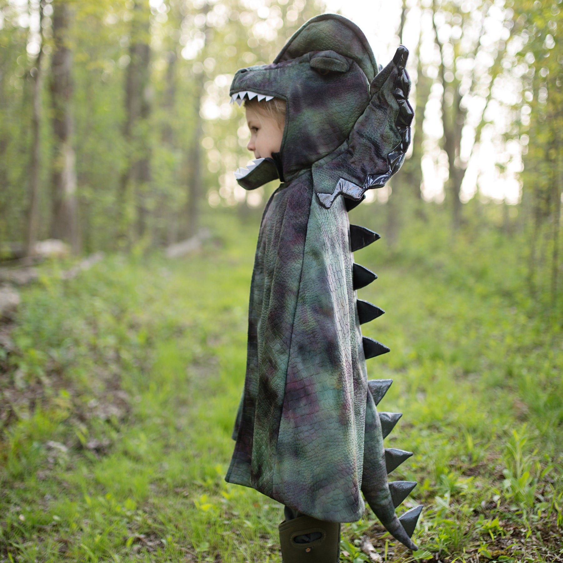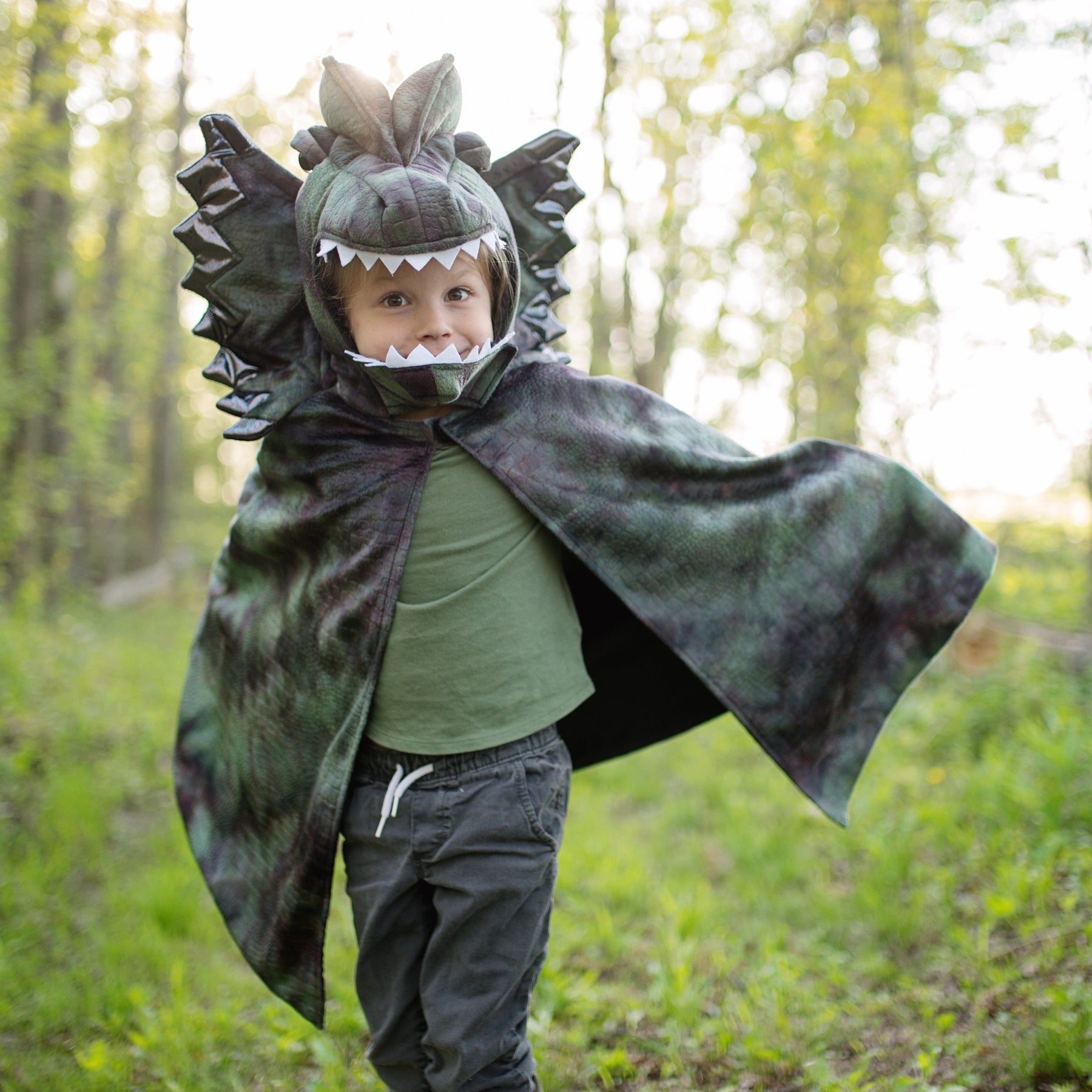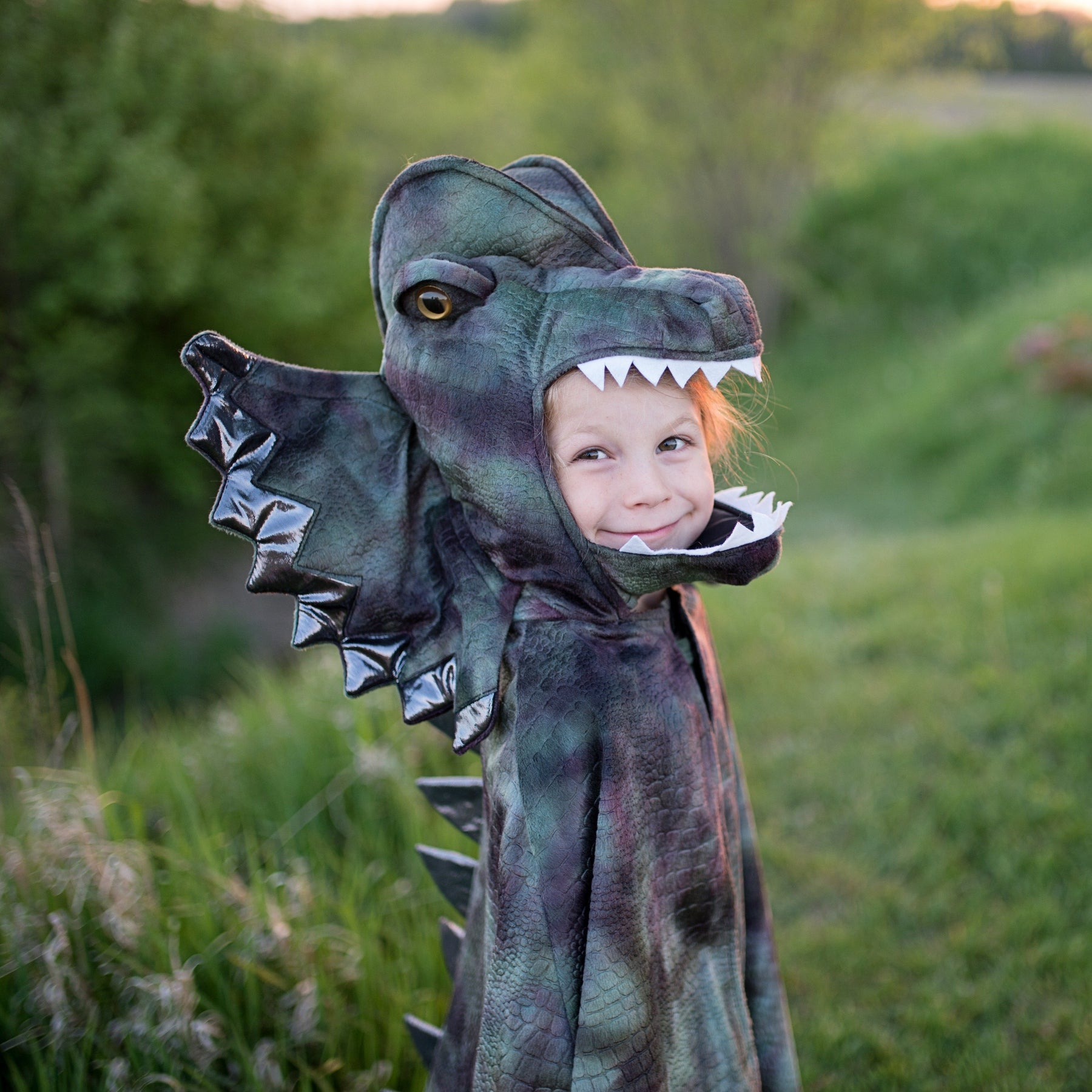 Roar! Watch your child transform into a prehistoric dinosaur in our Grandasaurus Dilophosaurus cape with matching claws. This cape provides a full dinosaur head with a removable mouthpiece to ensure a secure fit. This is great for Halloween or everyday adventures!
