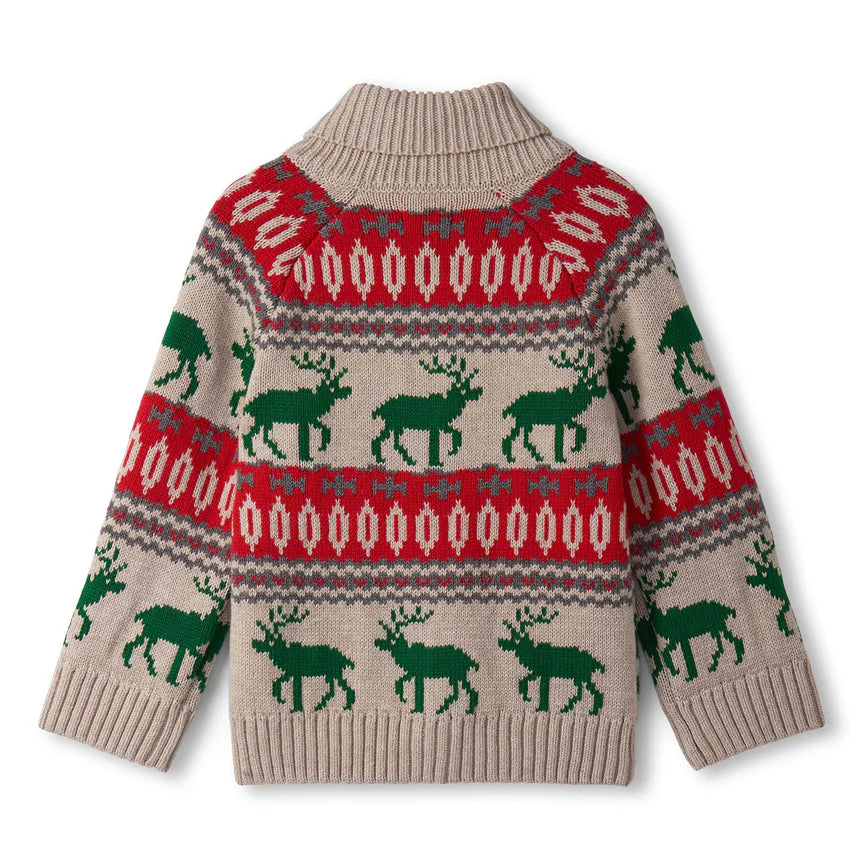 The Baby & Toddler Boys Winter Elk Shawl Collar Cardigan is a cozy layering piece designed with timeless holiday style, crafted from a soft cotton-acrylic blend for warmth and durability. Its beige base is accented with green, red, and gray in a traditional Fair Isle pattern, featuring reindeer motifs, geometric designs, and decorative stripes across the body and sleeves. A ribbed shawl collar adds extra coziness, while the four-button front placket with wooden-style buttons gives it a classic finish. Complete with ribbed cuffs and hem for a snug fit, this cardigan is perfect for festive outings and chilly days.