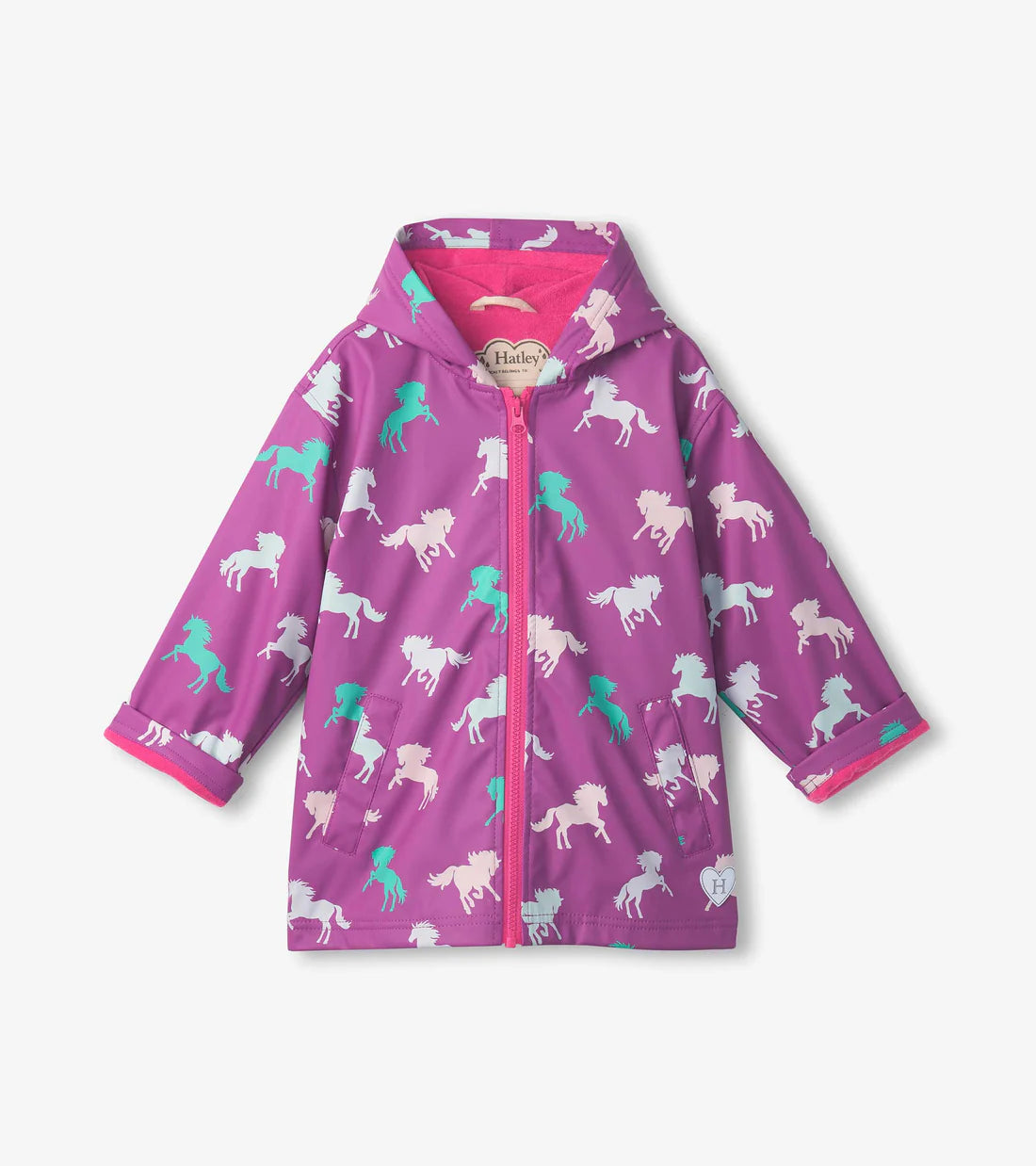 The Girls Leaping Horses Zip-Up Rain Jacket is an equestrian-inspired delight! Made from water-resistant polyester, this jacket features playful horse graphics that gallop across the design. Lightweight and easy to wear, it’s equipped with a zip-up front and hood to keep her dry on drizzly days. Ideal for girls who love adventure and style.