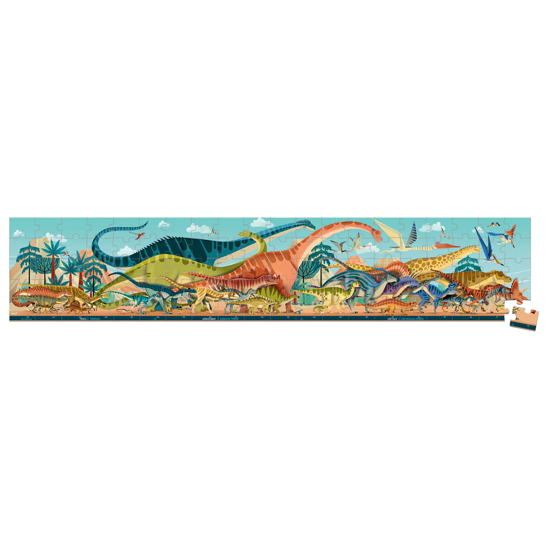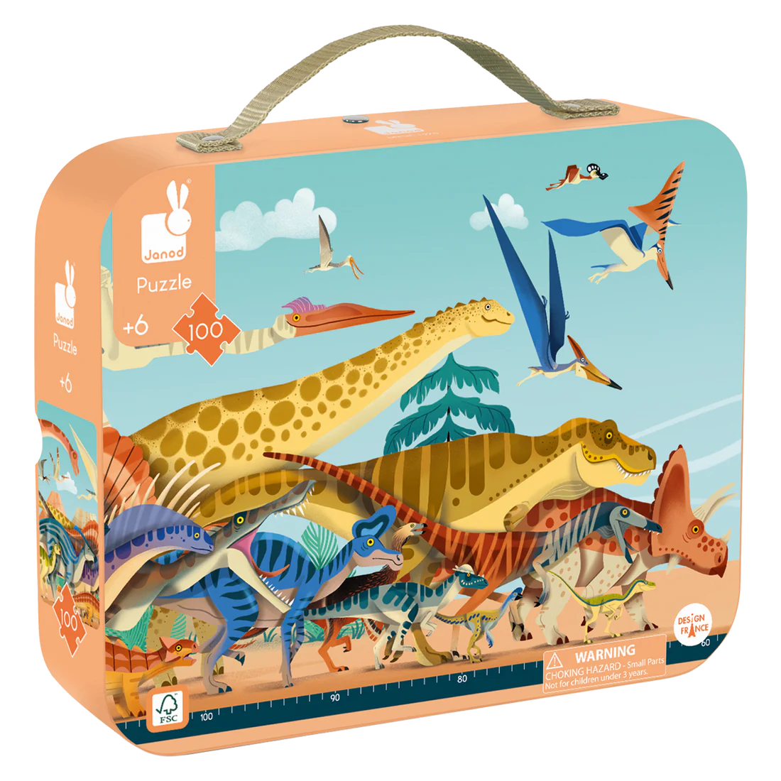 During which period did the Triceratops live? Triassic, Jurassic or Cretaceous? Find the answer with this stunning panoramic puzzle featuring a large number of dinosaurs, classified according to the period in which they lived. The puzzle has over 40 creatures and helps spark curiosity around the time of the dinosaurs. This cardboard puzzle is made up of 100 pieces and is 1 meter long when completed! What to impress young and old! The pretty suitcase allows you to store and transport your puzzle everywhere. A poster is also inside to serve as a model during the realization. The printing is based on vegetable inks, the cardboard from sustainably managed forests.