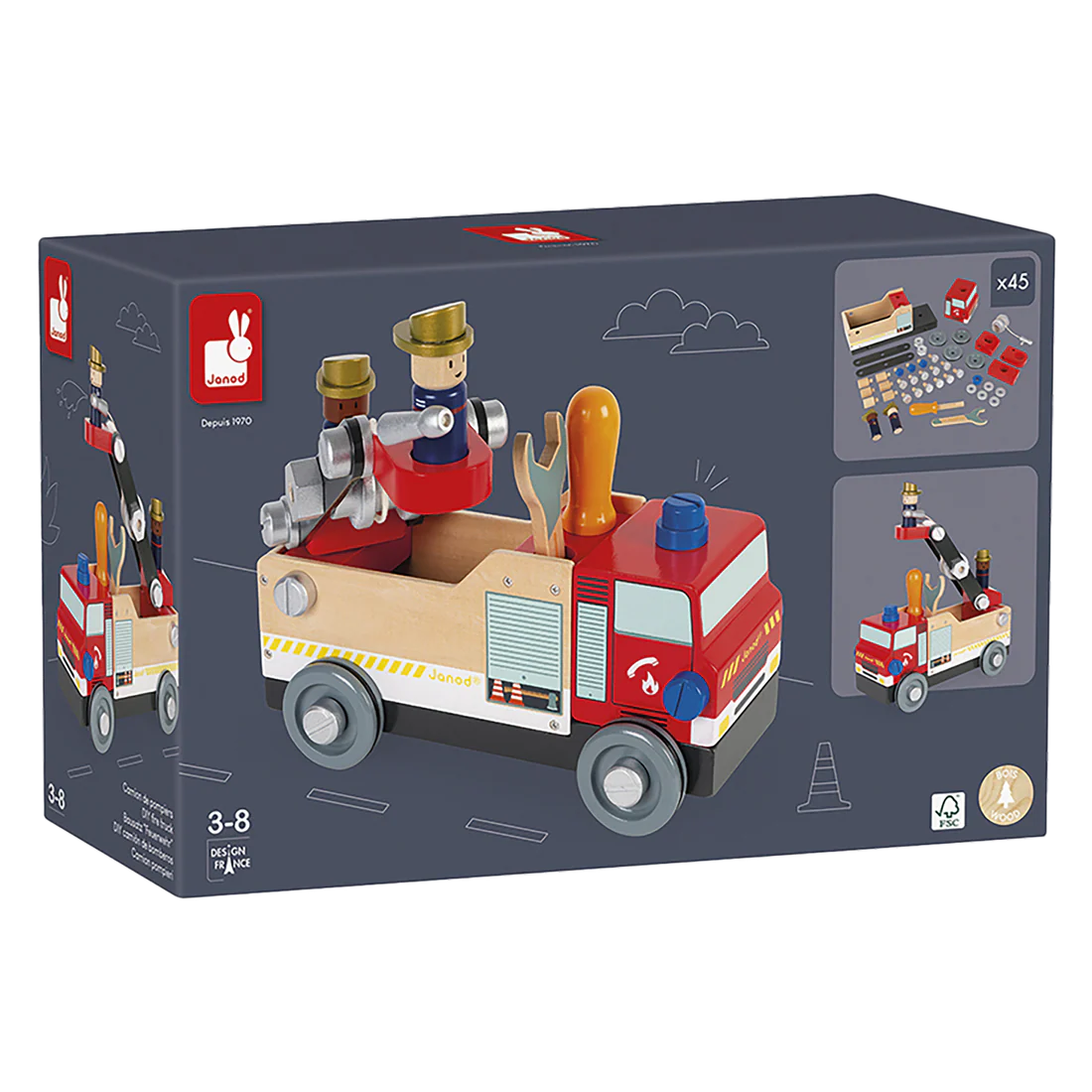 Nee-naw, nee-naw! If the sound of sirens regularly resounds round your home, your little ones will love this attractive, build-it-yourself fire engine! Ideal for children from 3 to 8 years old, this 2-in-1 wooden toy will delight DIY enthusiasts and budding firefighters alike! This set starts as a construction kit, as kids try to put the beautiful fire engine together using the nuts, bolts and screws provided. Once the vehicle is assembled, it's time for them to switch on their imaginations and send their new fire engine out on all sorts of adventures! This 45-piece set includes 2 tools, 2 firefighters and assembly instructions. The fire engine is made of FSC®-certified wood from sustainably managed forests.