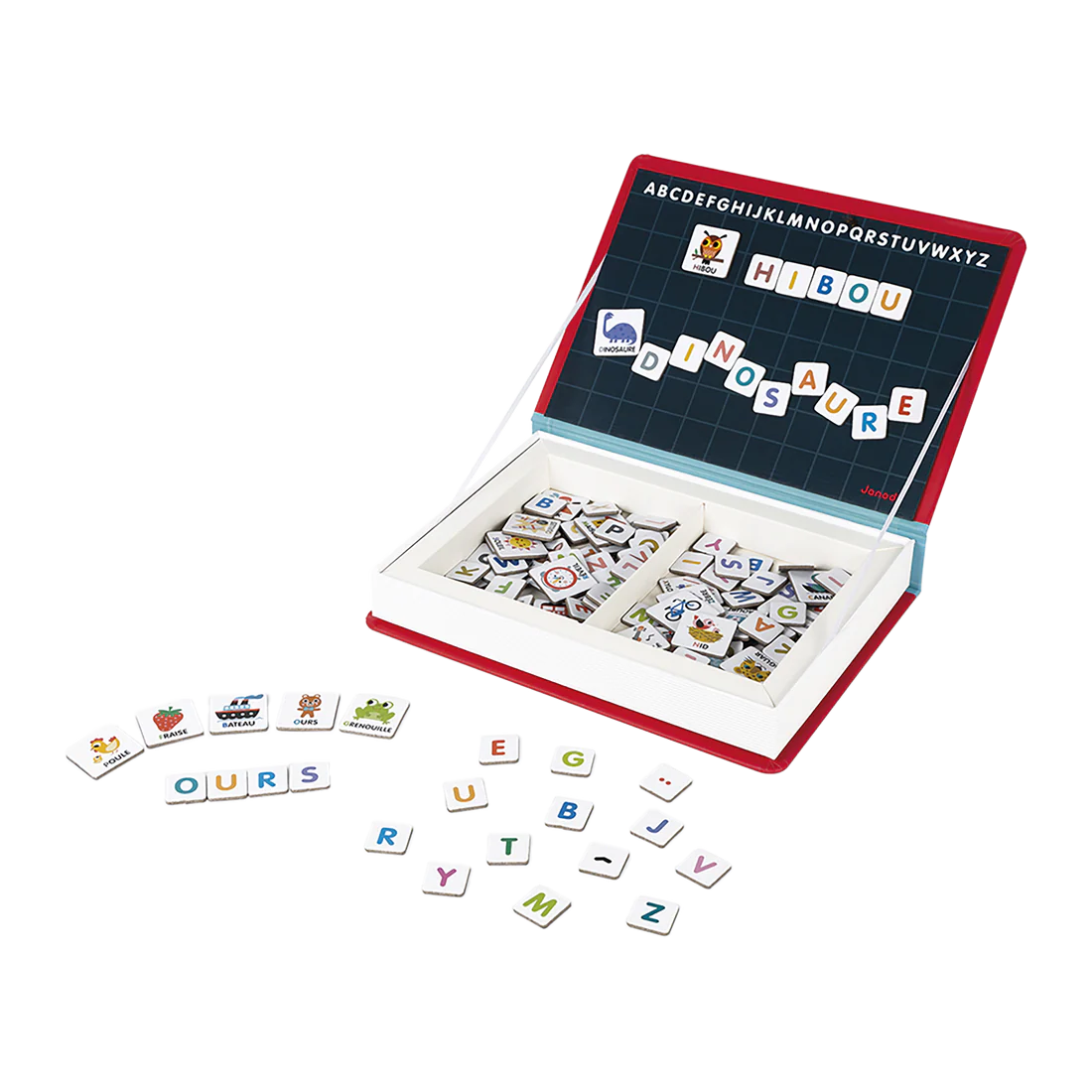 The Magneti'Book are clever educational games that can be carried everywhere and stored easily! These pretty rigid cardboard boxes contain everything needed to have fun thanks to magnets and a inclined plane where children can make and unmake their creation over and over again! This Magneti'Book dedicated to the alphabet is an ideal support for children from 3 years old who are familiar with letters! They can play at recognising vowels and consonants, then form their first words with the help of the picture magnets. Learning sounds and building words becomes a real pleasure with this educational game. The set contains 26 picture magnets and 116 magnetic alphabet letters with accents for all possible combinations! A great gift idea for preschoolers!