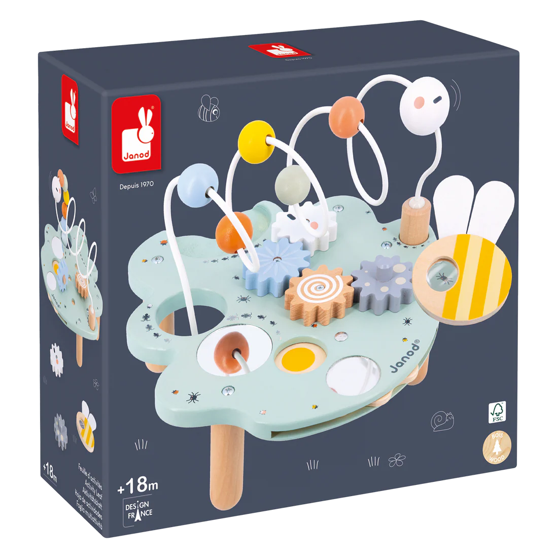 Give your baby a world of discoveries with this wooden activity leaf! Inspired by nature, it features 6 activities: a mirror, a fabric caterpillar to handle, a sliding ring, a ladybug to move, a spinning wheel, and a felt bee. This early learning toy promotes fine motor skills, sensory development, and hand-eye coordination. Its compact format makes it perfect for little hands and travel. Materials: wood (plywood and cherry wood), felt, and fabric. Water-based paint. Dimensions: 29.5 x 23 x 2 cm. Suitable from 18 months.