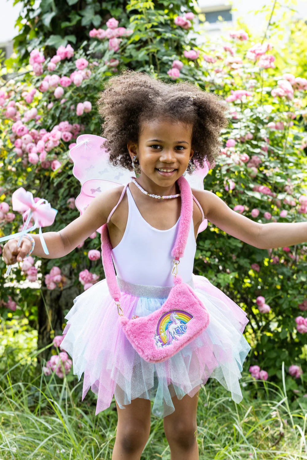 Let your little one carry a world of magic with the Pink Rainbow Crossbody Purse! This furry, soft-touch purse features a charming pink unicorn at the center, surrounded by a dazzling rainbow backdrop sprinkled with twinkling stars.