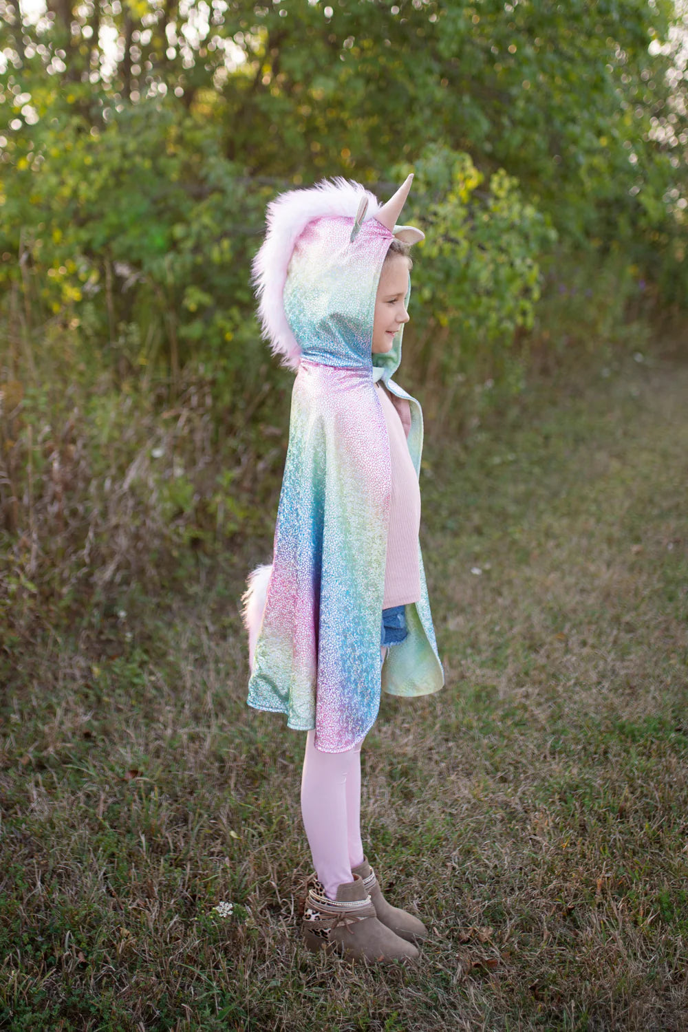 Introducing the reversible unicorn dragon of your dreams! With one side featuring a beautiful pastel rainbow unicorn and the other side featuring a fierce pastel dragon, your little one will be the talk of the town! Made with a sparkly pastel pink, purple, blue and green fabric, your child can choose between a fuzzy unicorn or our traditional embossed, crushed velvet fabric with stuffed metallic dragon horns all the way down the back. This cape will make all of your dreams come true!