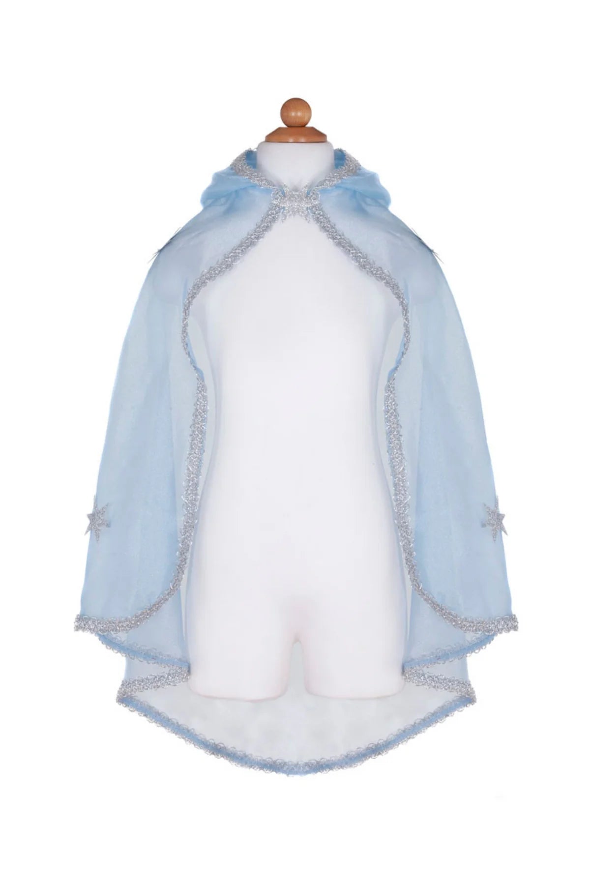Cast icy spells with our classic Snow Queen Cape. Made from blue crystal organza, this cape features silver glitter sparkle stars, and a large hood. The entire cape is trimmed in silver braided trim for some extra added elegance.