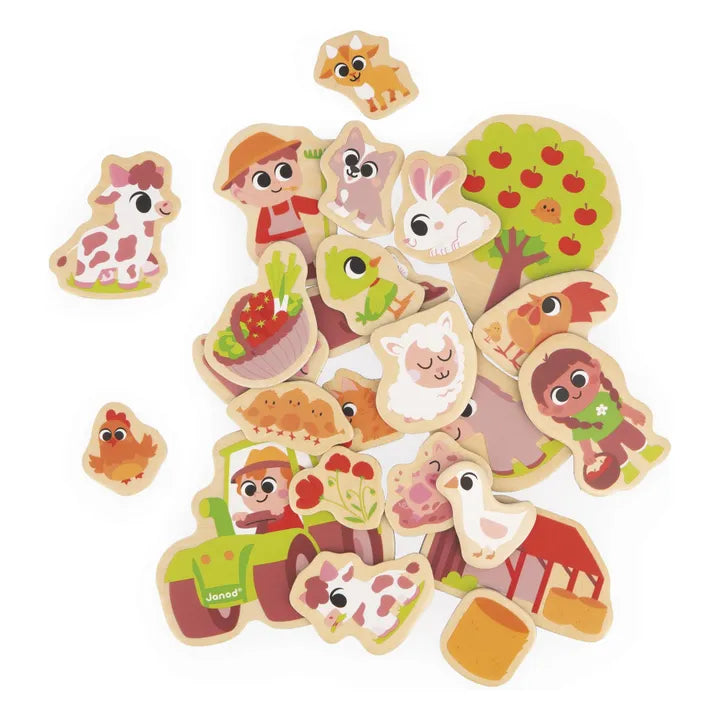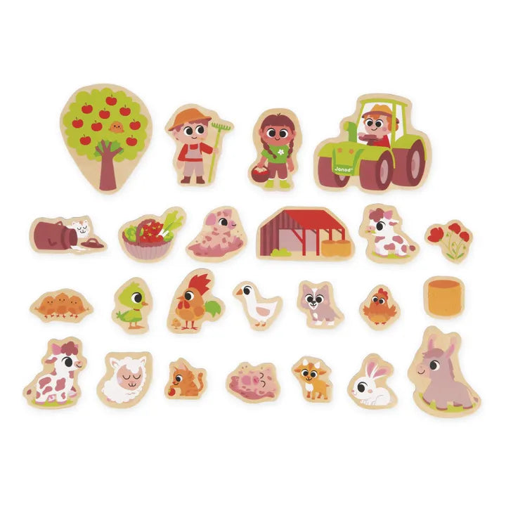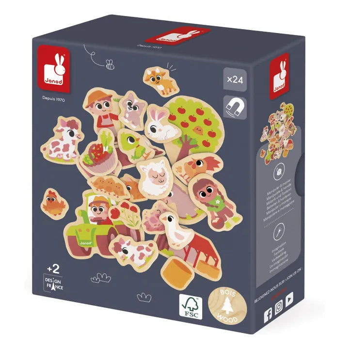 Wooden magnets for boards (or another magnetic surface) based on a farmyard theme. Perfectly suited for discovering the world of farms while having fun. Dims of the tractor magnet : 7,5 x 6 cm