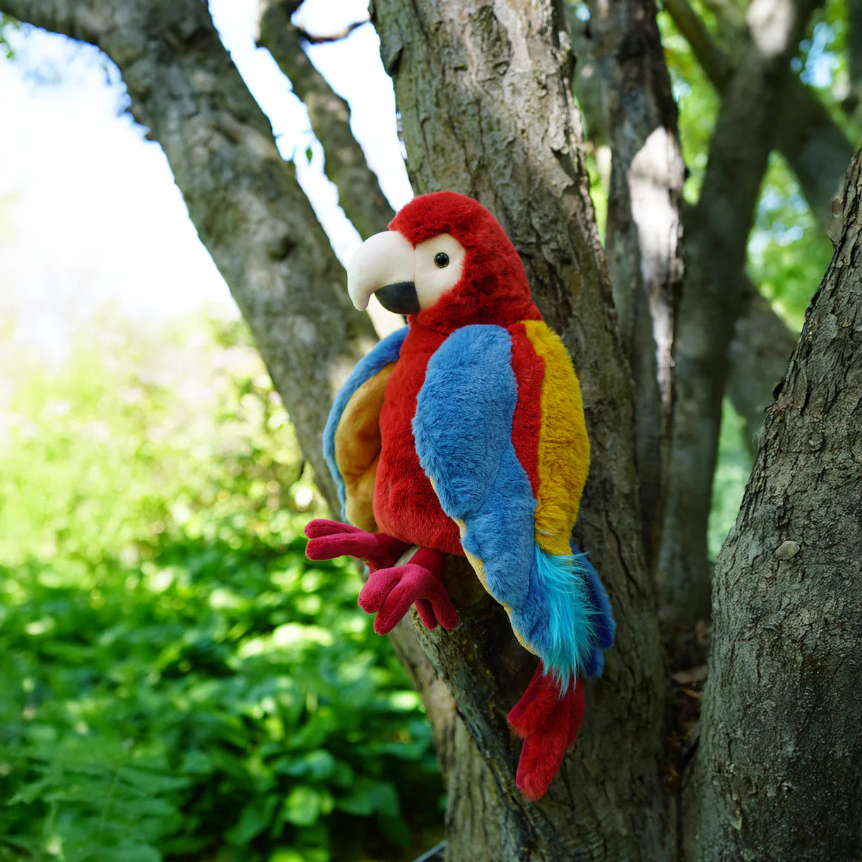 Meet Papaya, a burst of color and charm. This playful parrot features a kaleidoscope of plush, soft feathers in vivid red, bright blue, and sunny yellow. Papaya's playful eyes and cheerful expression make every playtime an adventure.