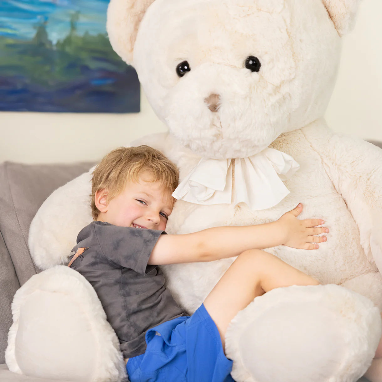 Patrick Huggy Bear is a giant, cuddle-ready companion made for big hugs and cozy moments. His ultra-soft cream fur, gentle embroidered features, and plushly padded limbs make him perfect for storytime snuggles, nursery decor, or as a comforting keepsake.