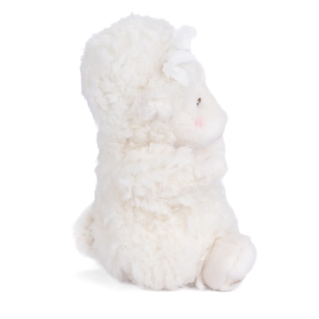 Baby Molly, a plush little lamb with soft white fleece that beckons for cozy cuddles and warm embraces. Adorned with a cute hair bow, she captures the essence of playful elegance. Her pink stitched nose and gentle brown eyes radiate a comforting warmth, inviting endless moments of love and storytelling. Crafted with care, Baby Molly is a timeless treasure, ready to become a beloved part of your family and create cherished memories.