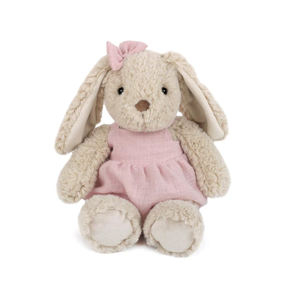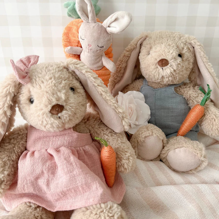 Bettie Bunny, the most delightful little bunny who hopped straight out of a blooming, magical garden! With her fur as soft as a cloud and velour-lined floppy ears she's the perfect blend of charm and cuddles. Dressed in her darling pink dress, Bettie adds an extra touch of sweetness with her precious pink bow, nestled ever so perfectly in her floppy ear. Her sparkling eyes twinkle with a playful glint, and her dangly legs are just begging for a wobbly dance! Bettie Bunny is ready to sprinkle joy wherever she goes. Whether she's topping off an Easter basket or giving the best snuggles to brighten a little one's day.